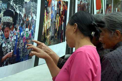 9月26日,几位少数民族妇女被一幅摄影作品吸引。