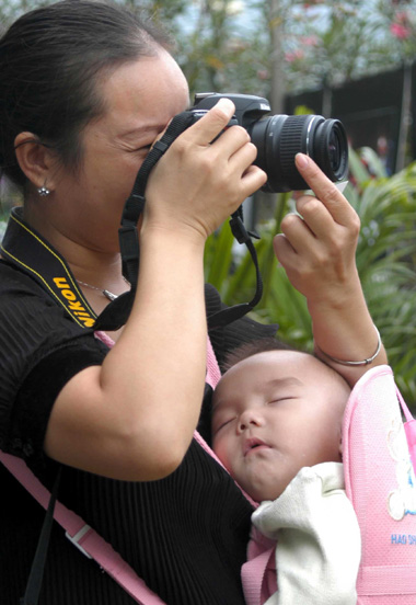 9月26日,在第四届国际摄博会图片展现场,从深圳到都匀采风的画家陈清带着孩子在拍照。
