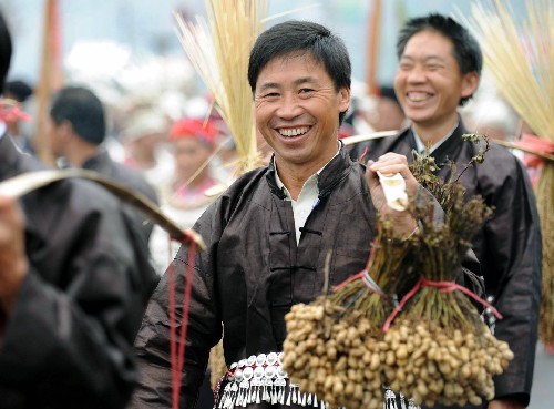 10月4日,在仰阿莎文化节开幕式上,苗族男子参加盛装展示巡游活动。