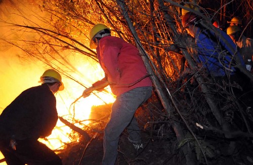2009年2月25日晚,贵州龙里县龙山镇余下村的村民正在灭火。