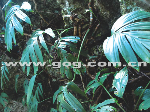 3月8日,笔者随同中央电视台七频道《乡土》摄制组在荔波县小七孔景区拍摄时,在一潮湿岩壁上发现一串串颈似竹节、叶似龟背的蕨类植物,据专家认定,属稀有品种龟背竹。