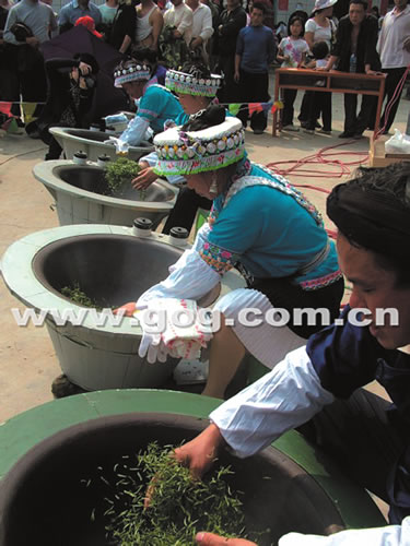 当天,在云雾缭绕的云雾山七里冲,苗族少女身着节日盛装,到绵延数里的茶山上采摘第一批茶青,小跑回到附近的茶叶加工点,放到温热的锅子中,经过约半小时的炒制,今春首批云雾贡茶即新鲜上市,现场人工炒制的特级云雾贡茶每市斤卖价近千元,一般的也在每市斤600元,且供不应求。