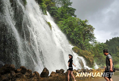 7月5日,两名游客在荔波小七孔景区道路边的一个瀑布旁游玩。