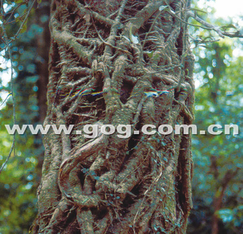 近日,在荔波茂兰原始森林保护区内,发现一枝绞杀藤,把一株三人合抱的大树,严严实实地给绞杀得“透不过气”来。