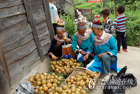 寨子里的苗族人,用今年丰收的梨子款待来参加“六月六”的游客。