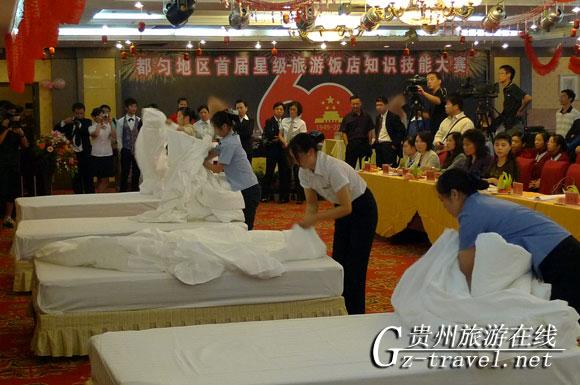 春节前,贵州省都匀市首届旅游行业技能知识大赛在都匀桥城宾馆举行,来自黔南州内30家旅游企业的200多名旅游企业的选手参加了宴会摆台、中式铺床、导游带团讲解等项目角逐,促进边远少数民族旅游企业水准,提高宾馆、导游服务水平。