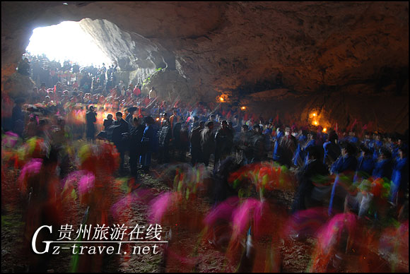“跳洞”是贵州省龙里县摆省乡果里苗族村过年的传统节目,每年的农历正月初四至初九都会在寨外的溶洞里举行“跳洞”过节。岩洞在当地苗族生活中的意义十分重大,青年男女谈情说爱选择岩洞,苗族的先民甚至居住在岩洞之中,岩洞又是安葬死者的去处,因此“跳洞”是当地苗族村民对本民族传统的怀念和尊重。