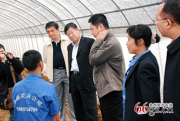 图为:省委副书记王富玉、州委书记黄家培、黔南州副州长都匀市市长胡晓剑在都匀墨冲花卉基地