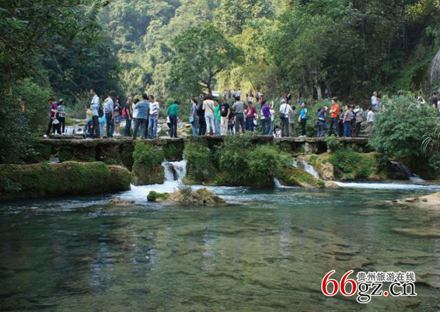 国庆期间游客在小七孔68级跌水瀑布游览