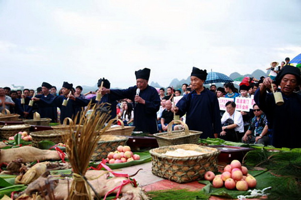 当天,5名德高望重的水书先生在卯坡上进行了开光祭祀仪式,水书先生按照传统的水族祭祀方式,摆上糯米饭、传承水书等供品,敬祖祭天,在庆贺今年将喜获丰收的同时,也祈求来年风调雨顺,万事如意。