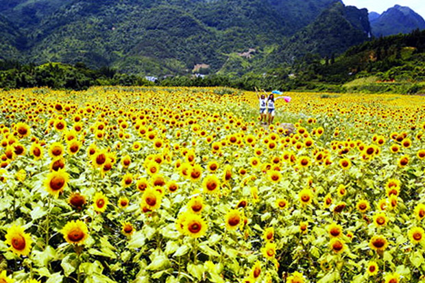 新华网贵州频道7月22日电 近日,笔者来到贵州荔波瑶山乡高桥村,走访了“四季花海”生态园。眼下,园里的油葵、高原格桑花开得正艳。金黄耀眼的花朵映衬着布依木楼、绿树青山,勾勒出一幅幅金黄灿烂的美丽画卷,吸引着各地的游客涌来,或拍照留念定格美丽的风光,或倘佯在花田里融入风景中,流连于美丽乡村的醉人风光里。