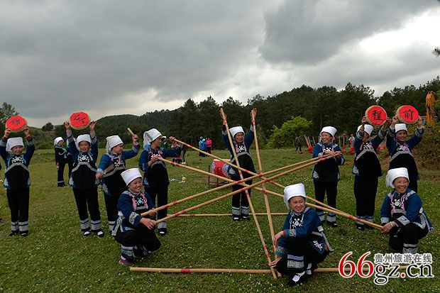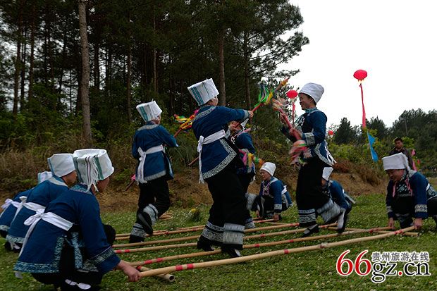 竹竿舞,是布依族群众在生产生活中自创的一种庆祝舞蹈,一般是在大家酒酣饭饱后,来到山坡上,竹声叮咚,一起欢跳。庆祝稻谷丰登,祝愿来年有更好的收成。