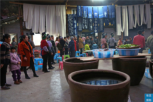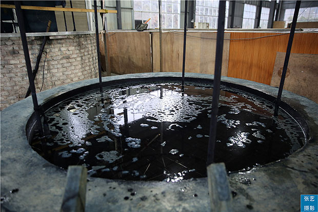 创业初期,张义琼只生产一些苗族服饰、墙上装饰品,产品种类十分有限。但之后,她利用原先做过批发土布生意的机会,接触到上海、台湾的一些经销商,并得到了他们对于蜡染的一些建议。图为张义琼染织厂房里的大染缸。