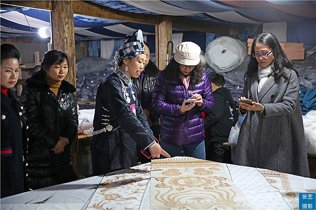 2012年,张义琼通过自筹加贷款,在三合镇晨光村建起一个1600多平方米厂房。她把往日的好姐妹都招进厂,做起了苗族蜡染加工。同时购置了6台工艺制造机、5台大型染缸,开始带领着晨光村的8名苗族妇女踏上了蜡染布艺加工之路。