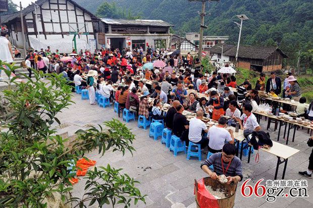 5月12日,农历四月初八,是布依族苗族的传统节日“四月八”。金溪村布衣族苗族村民欢聚谷仗寨,自筹资金近1万元,以“文明实践助推乡村振兴暨‘醉美别样四月八 渔樵耕读变形谷’”为主题,开展文艺表演、挑柴比赛、捉鱼体验、农家磨豆腐体验、观看农家古法酿酒及吃长桌宴、吃花米饭等活动,欢天喜地庆祝节日的到来,活动吸引来了贵阳及周边群众上千人前来参与。