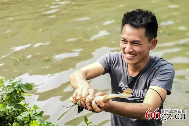 “看,我又捉得了一条鱼。”话音刚落,只见一位游客举起手中捉到的鱼,立刻便迎得鱼塘边观看群众的一阵掌声。5月12日,在贵州省龙里县洗马镇金溪村谷仗“变形谷”的一个鱼塘内,一场捉鱼体验活动正在进行。