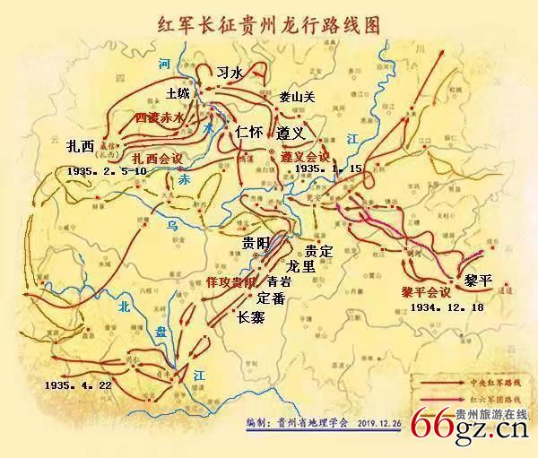 1935年4月,红军长征过开阳、乌当,到龙里,在龙里洗马镇故意架浮桥,佯装东进到黔东根据地与红二、六军团会合,实则转西过黔桂公路往花溪青岩佯攻贵阳,往南经定番(今惠水)转西过长寨、广顺(今长顺)往紫云、贞丰、兴仁、盘县进云南。从顺利走向胜利。贵州省地理学会 供稿