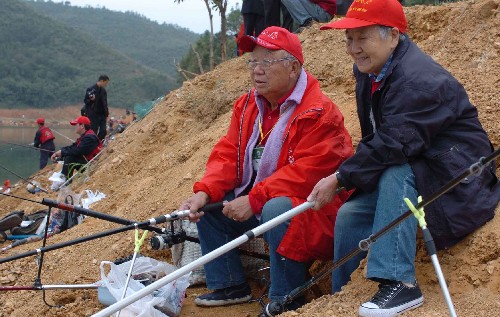 北京医院退休职工赵勤(右二)与老伴在野钓比赛中。