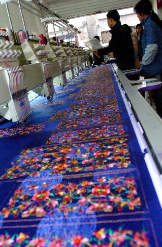 在贞丰县“民族刺绣坊”,工人用机器制作苗绣