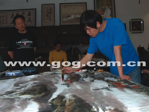 图为唐天源现场挥毫创作《金州云水图》。