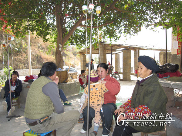 来到这里,听到了滔滔的南盘江水,看到了高而陡的大山,在南盘江大桥的一端,我见到了黄跃琼的诊所。映入眼帘的是榕树下到处是坐着输液的人,有小孩、老人和妇女,有的将输液瓶挂在榕树枝上、有的挂在墙壁上、有的用杆子撑着……在这里似乎能用到的、能想到的都派上了用场,现场一派繁忙的景象。