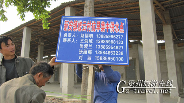 图为工作人员在固定集中供水点指示牌时的情景