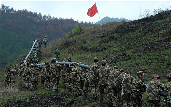 2010年4月1日,援建部队官兵在搬运输水管道。