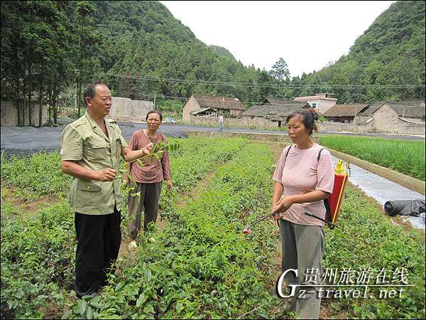 金银花种植大户、村支书陈坤学在指导农户加强田间管理时的情景