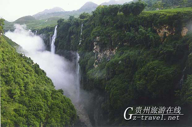 地裂奇观———马岭河峡谷被誉为“天沟地缝百瀑谷”、“地球上最美丽的疤痕”。峡谷长约75公里,最深达280米。峡谷以地缝嶂谷、群瀑悬练、碳酸钙壁挂的喀斯特地貌景观为显著特点,集“雄、奇、险、幽、壮、秀、美”为一体。峡谷景观中最为奇特的当数钙化壁瀑布群,近百条瀑布沿这钙化崖凌空而降,飞珠溅玉,奇特壮观。