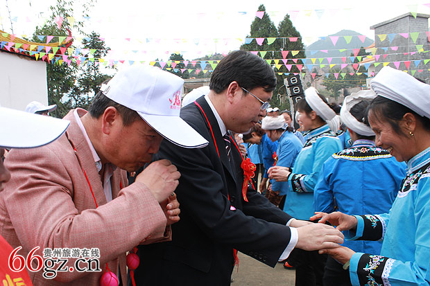 布依人的山歌比星星还多,布依人的米酒又醇又香,布依人的糍粑吃了忘不了,布依人的天性豪爽,布依人的美酒斟满祝福,布依人的红鸡蛋送来吉祥如意。当天上午12时30分,热情好客的布依人一边唱起山歌,一边为嘉宾们敬上香烹烹的美酒、端来热腾腾的糍粑、送上红彤彤的鸡蛋。随后,文艺演出在原汁原味的《山歌伴舞》中拉开序幕。紧接着《布依娃舞》、《山歌对唱》、《板凳龙舞》、《八音伴舞》等一个个精彩节目纷纷登台亮相。毛杉树下,布依情歌此起彼伏,布依青年或三五成群,或两两相对,唱情歌,表情意,久久不愿散去。来自兴义滴水、兴隆石盘、毛杉树村的《山歌对唱》,将布依小伙和姑娘追求幸福甜美的爱情演绎得精彩绝妙。原汁原味的布依歌舞令人如痴如醉,一个又一个精彩的节目将活动推向一个又一个高潮。