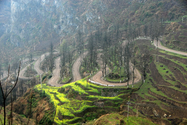 美军抢修后保留至今的二十四道拐公路,全长4公里,有效路面宽约6米,山脚第一道拐与山顶第二十四道拐间的直线距离约350米,垂直高度约250米,坡的倾角约60度左右,驱小汽车由下至上,爬完24道拐约需8分钟,由上至下约6分钟,虽坡陡弯急,但无惊恐之感。现在由县公路局养护,仍可通车,但只有少量车辆通行。