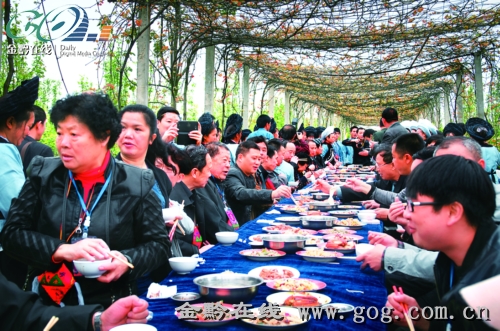 春天出叶的葡萄架下,游客、嘉宾和布依儿女在歌声中吃起长桌宴,喝起布依酒。