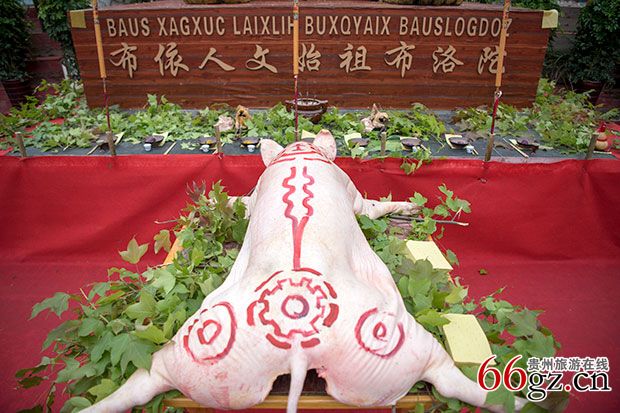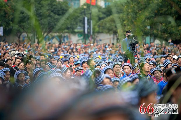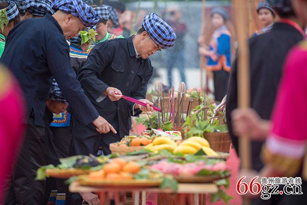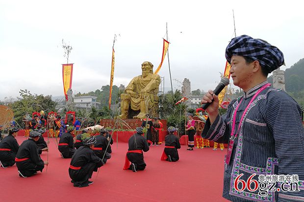 随后,在气势磅礴的音乐中,一场布依祭祀大典揭开序幕,布依族摩公在主摩公的带领下进行布依族传统的祭祀庆典活动,祭奠布依人共同的人文始祖布洛陀,并向大自然表达感恩之情。