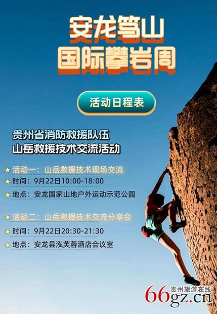 此次攀岩周以“文体旅融合·高品质生活”为主题,由贵州省体育局、黔西南州人民政府主办,共青团贵州省委、贵州省消防救援总队协办,贵州省山地户外运动发展中心、黔西南州文化体育广电旅游局、安龙县人民政府承办, 贵州省体育彩票管理中心提供公益支持。 攀岩周将继续举行极限户外运动大师主题分享会、民族篝火晚会暨主题焰火秀、“火热青春·加油安龙”119消防跑、“青春遇见贵州·感受多彩魅力”——美美安龙加油跑、“多彩贵州”攀岩运动发展主题沙龙暨电音派对、安龙笃山迷你山地越野跑等系列活动。