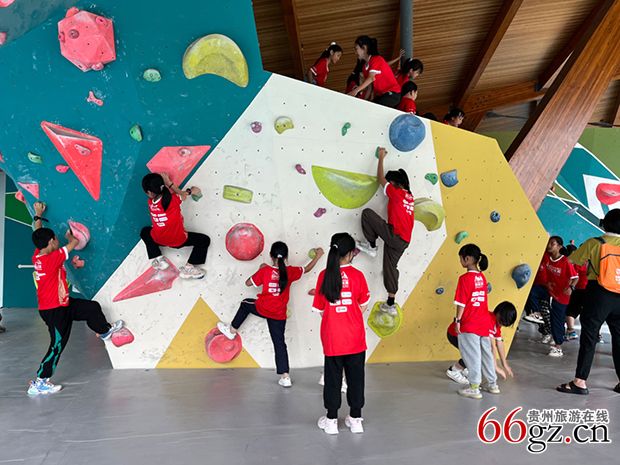 在安龙国家山地运动示范公园人工攀岩馆,紧张进行青少年男女两项全能、速度预赛,其中最小的运动员仅有10岁。赛场上身穿红色体桖的孩子们特别抢眼,这是近百人的广西乐业县参赛队。该县为选拔有攀岩天赋的孩子学习攀岩,将学生们分批接到攀岩基地免费体验,进行攀爬素质和体能测试选拔一批学生,于2020年7月成立了乐业攀岩学校。目前从7000多名学生中选出1000多人到基地免费训练,其中优选经常训练的100多人组建了攀岩队。县委县政府通过相关政策扶持研学、探险旅游,用其收入反哺攀岩训练。