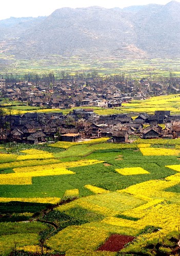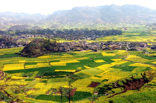 3月的贵州山区,金黄色的油菜花簇拥着依山傍水的农庄,好似一幅田园山水画,令人心旷神怡。