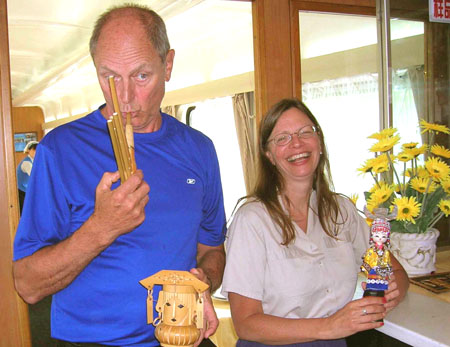 这对老外对列车上摆放的少数民族工艺品爱不释手。