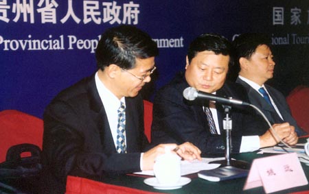 贵州省委宣传部副部长姚远和贵州省旅游局副局长傅迎春、安顺市委书记陈海峰在主席台上
