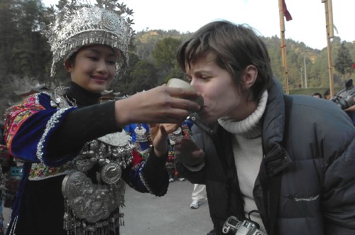 11月20日,在贵州省黔东南苗族侗族自治州雷山县郎德苗寨,苗族姑娘用苗家隆重的迎客礼仪向一位海外旅行商买家敬酒。