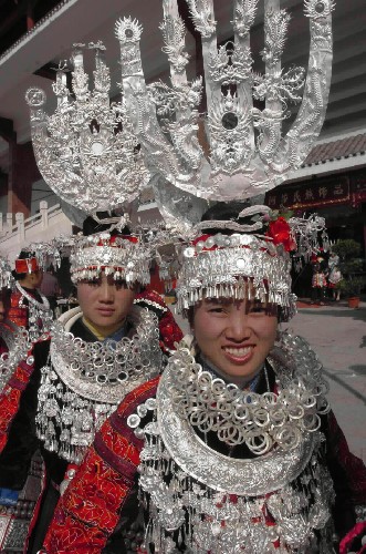 11月20日,在贵州省黔东南苗族侗族自治州凯里市,苗族姑娘在展示精美的苗族头饰。