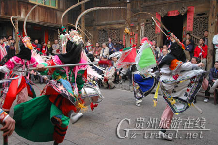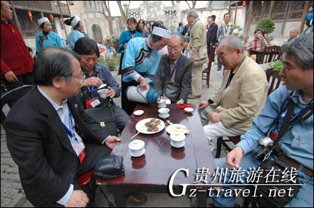 在屯堡古镇的演武堂,日本客人观赏了精彩的民间戏剧表演——屯堡地戏。也许是因为张艺谋和高仓健的《千里走单骑》,也许是对异域文化的好奇,日本客人纷纷和地戏演员合影留恋。