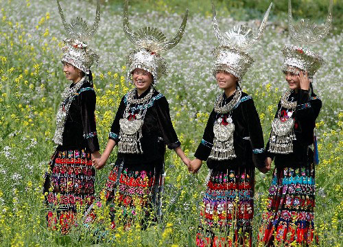4月8日,贵州省台江县阳芳村的苗族姑娘盛装参加姊妹节的庆祝活动。
