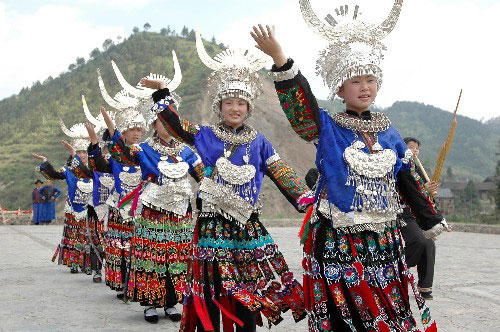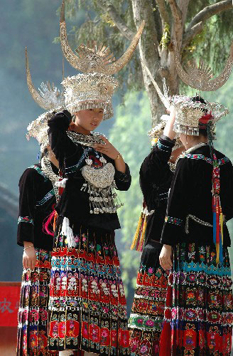 4月8日,贵州省台江县阳芳村的苗家女子盛装参加苗族姊妹节庆祝活动。