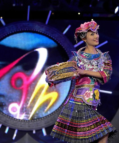7月26日,仡佬族姑娘王亚炜在比赛中展示民族服饰。 当晚,2006多彩贵州旅游形象大使第二场决赛在香港会展中心举行,26名参赛选手以及17位贵州世居少数民族姑娘登台亮相。这项赛事还将在上海、北京举办两场决赛,最终决出“多彩贵州”旅游形象大使。