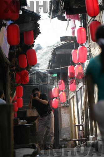 一位摄影记者在丙安古镇采访(6月19日摄)。丙安家家户户挂红灯笼,至今基本保持着明清以来的古镇原貌。