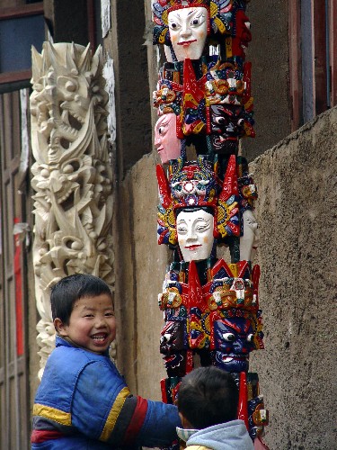 两名孩子在傩戏面具柱旁玩耍。