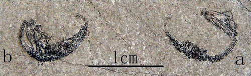 这是在贵州兴义发现的两个体长仅23毫米-25毫米的贵州龙化石(4月5日摄)。