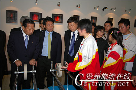 贵阳一中学生向二阶俊博一行介绍物理实验