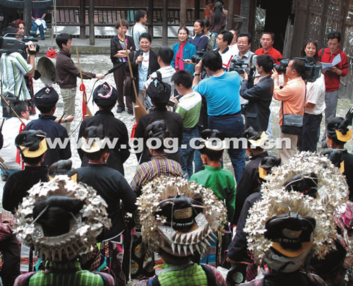 舞台是村里的场坝,“演员”是刚从田里回来的农民,伴奏也仅有芦笙和铜鼓。大嫂背着小孩,老汉叼着烟袋,地地道道的苗家铜鼓舞、锦鸡舞激荡着艺术家们的职业敏感。专家们不仅为之心动,也为之身动,合着芦笙的节奏,牵起乡亲的手,一起欢快地共舞……这样的场面反复出现在采风行程中。