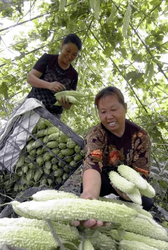 7月12日,在贵阳市乌当区高新路街道办事处阿栗村,村民刘贵芬(右)在采摘苦瓜。2006年3月到今年7月,刘贵芬家种的2亩苦瓜收成8000多斤,收入8000多元。